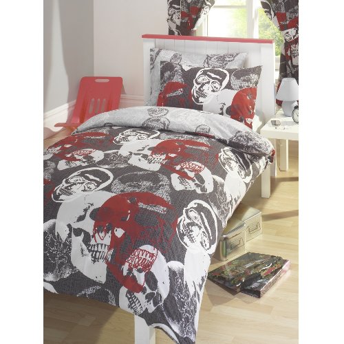 Kids single bed reversible duvet cover with a matching pillowcase which is designed by kids' club. Our quality bed linen is manufactured to give an outstanding softness and smoothness as well as long lasting durability. This set has been woven with highest quality yarns. The fine cotton and easycare polyester blend gives a superior finish. The design of the duvet cover is Skulls with different background colours. Material of the bedding set is 50% polyester and 50% cotton and it is machine washable. This bedding set includes single bed duvet cover 135cm x 198cm (53" x 78") and a matching pillowcase 48cm x 74cm (19" x 29").