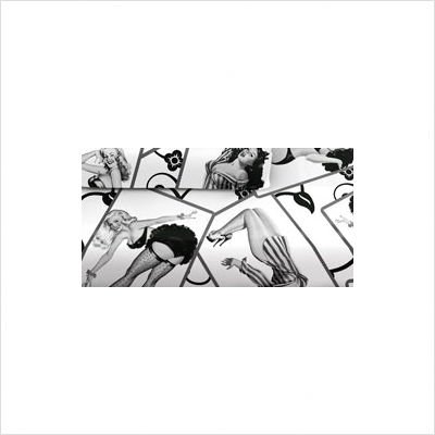 Black and white pin up girl print comforter. 5 playful pin ups stripe a pose in their individual post cards.
