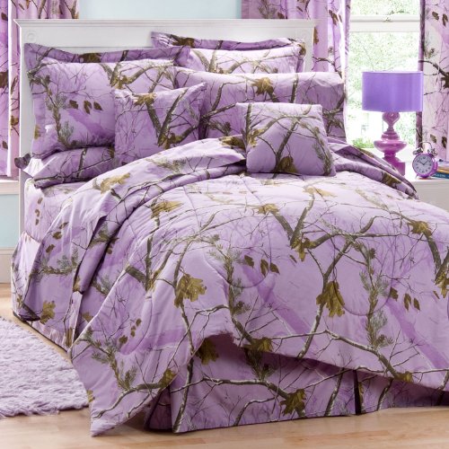Realtree AP Lavender Camo Queen Comforter Set. Queen Comforter Set Includes: Queen Comforter, Queen Bedskirt and 2 Standard Pillow Shams. Cotton/Poly Blend; Matching Comforter Set & Accessories Available. Machine wash & tumble dry low in commercial appliances.