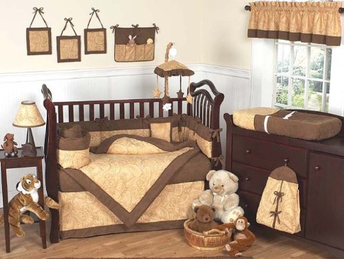 Our Designer Camel and Chocolate Paisley Boutique 9 pc. Crib Bedding Ensemble has all that your precious sweetie will need. With it's luscious Camel and Chocolate Paisley Microsuede, this super-soft set creates a stunning boutique look. It has a beautiful and unique paisley pattern imprinted onto soft micro suede. It will fit all cribs and toddler beds. The 9 pcs. included in this set are: comforter, bumper, skirt, fitted sheet, toy bag, decorative throw pillow, diaper stacker, and 2 window valances. JoJo Designs creates various coordinating room accessories for all of their childrens bedding sets including mobiles, lampshades, changing pads, and wall decor.