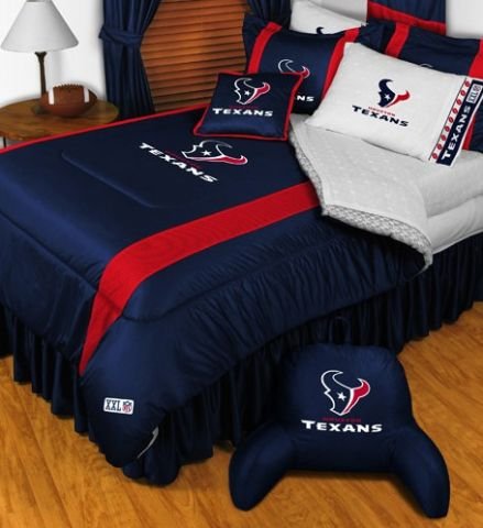Save big and show your team spirit with Sidelines NFL Houston Texans Bedding Set, including the Comforter, Sheet set, Pillow sham and Bed skirt! This Comforter is made from 100% Polyester Jersey Mesh - just like what the players wear. The fill is 100% Polyester batting for warmth and comfort. Authentic team colors and logo screen printed in the center. Microfiber Sheet Hem sheet sets have an ultrafine peach weave that is softer and more comfortable than cotton. Its brushed silk-like embrace provides good insulation and warmth, yet is breathable. The 100% polyester microfiber is wrinkle-resistant, washes beautifully, and dries quickly with never any shrinkage. The pillowcase has a white on white print beneath the officially licensed team name and logo printed in vibrant team colors, complimenting the NEW printed hems. The Teams are scoring high points with team-color logos printed on both sides of the entire width of the extra deep 4 1/2 hem of the flat sheet. 2" flanged edge that decorates all four sides of each Pillow sham. Made of 100% polyester jersey mesh, just like the players wear. Bedskirt available in team color with no team logo printed on them. Includes: - Comforter - Full/Queen 86" x 86", - Flat Sheet - Full 81" x 96", Queen 90" x 102"., - Fitted Sheet - Full 54" x 75", Queen 60" X 80", - Pillow case Standard - 21 x 30, - Pillow Sham - 25" x 31", - Bedskirt - Full 76" x 54", Queen 80" x 60" ,