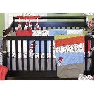 The Dr. SeussÕ Cat In The Hat 4-Piece Crib Bedding Set by Trend Lab mixes the classic Cat in the Hat black and white with barn red, cornflower blue, avocado green, golden yellow and mango orange. A whimsical Cat in the Hat scatter print is mixed with a diamond print percale and black and white gingham seersucker framing and enhanced by vibrantly colored star-embossed soft velour. Peek-a-boo embroideries on the bumper and quilt bring style inspired by this classic book. This themed set features a framed quilt, 4-piece bumper, crib skirt and sheet.