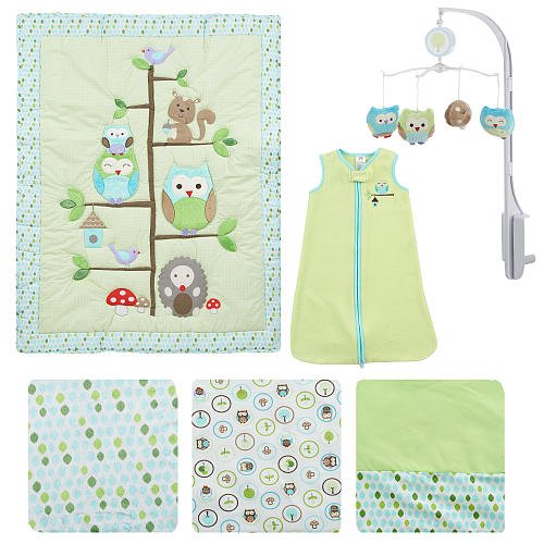 This 6-piece Just Born Babywise Crib Set evokes the calm and peacefulness of nature with its sweet forest theme. The cozy comforter, crib sheet and wearable blanket are decorated with cute animal and tree graphics, while the dust ruffle and changing pad cover are designed in coordinating colors and patterns. Plush owls and a mushroom dangle from the mobile, which plays a sweet and soothing song.The Just Born Babywise 6-Piece Crib Set features:Includes a comforter, crib sheet, dust ruffle, wearable blanket, changing pad cover, and musical mobileBedding set is compatible with standard 28 x 52-inch cribsDesigned in light blue, green, and whiteCozy 33 x 42-inch comforter is decorated with a tree and forest animals with fuzzy appliqued accentsSheet is embellished with a coordinating pattern of owls, leaves, and mushroomsDust ruffle has a 14-inch light green drop with a patterned edgeChanging pad cover is made of super-soft fabric and designed with an allover pattern of leaf shapesSleeveless wearable blanket has a full-zip front and is decorated with an embroidered owl and birdhouse; ideal from birth to 9 monthsMobile features dangling plush owls and a mushroom; when wound up it plays 'Brahms' Lullaby'Changing Pad Cover and Comforter: 100% polyester; Sheet: 100% cotton; Dust Ruffle Platform: 100% olefin; Dust Ruffle Drop: 65% polyester, 35% cottonMachine wash, tumble dryFits standard 28 x 52-inch crib mattressesSet is decorated with cute forest animal/tree graphics and soothing patternsChanging Pad Cover, Comforter and Wearable Blanket: 100% polyester; Sheet: 100% cotton; Dust Ruffle Platform: 100% olefin; Dust Ruffle Drop: 65% polyester, 35% cottonIncludes a comforter, crib sheet, dust ruffle, wearable blanket, changing pad cover, and musical mobileMachine wash, tumble dry