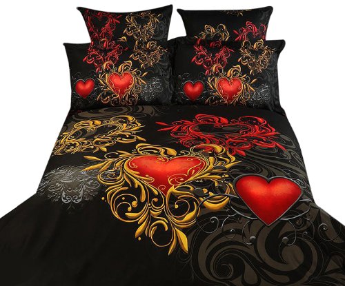 The utmost romantic bedding theme will come to play in your bedrooms mood with this fine linen bedding ensemble featuring red hearts and golden accents. These superb Dolce Mela Duvet Cover Sets are crafted with State of the Art reactive printing panels and natural plant dyes on 100-percent Egyptian cotton. They feature exclusive centered Hi-RES designs that retain the vibrant colors for many years of proper washing. Decorate with style or treat a friend to a housewarming gift or a bridal shower. Designed for exceptional softness and comfort with 100-percent soft cotton at 305 tc set includes: 1 fitted bed sheet, 1 duvet cover, 2 pillow cases and 2 pillow shams. Sateen weaving produce a soft and lustrous look and eliminate typical wrinkling. Package content and sizes in-inch: 1 fitted sheet 78 by 80 by 16 deep, 1 duvet cover 104 by 92, 2 pillow cases 20 by 36, 2 pillow shams 20 by 36 + 2-inch flange.