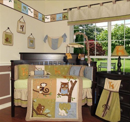 Forest Friends by Sisi Baby Design will take your baby on a trip into the forest with its colorful and playful design. In this baby bedding set, your baby will meet fun Forest friends including elephant, monkey, deer, owl and bird.The assortment of Colors including green, blue,brown and white creates a naturalistic feeling your nursery that you will absolutely love it! This baby bedding set is perfect for any little baby boy and girl. The whole set comes with 15 pcs set. This set is made to fit all standard cribs beds . Suggested Retail price $229.99