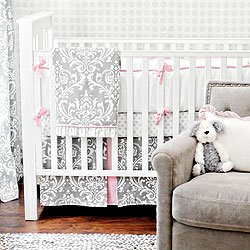 We are loving the combination of pink and gray colors. Our Stella Gray set pairs our Wisteria in Slate fabric with pink accents to create a chic and sophisticated look. The sheet is of Sunburst in Slate fabric, and the 17" tailored skirt is made from Wisteria in Slate with Cotton Candy pleats. The three piece includes a bumper, crib sheet and skirt.