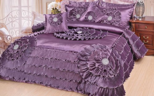 All over purple tiered curled edged side panels with corner raised floral shaped tiered curled edged decoration with jeweled embellishment within, the corners mimic the center piece floral decoration attachment. Comforter sets are designed to keep you updated and fashionable in the most convenient and inexpensive way. Comforter set includes: One comforter, two shams, twp cushion covers. Also it could be dry clean or machine wash warm, tumble tumble dry gentle/ low or drip dry, and use mild detergent and no bleach.