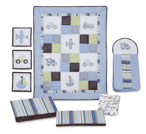 Rich browns, blues and greens, stripes and gingham, and classy blue on blue checked polyester fabric with brown suede binding, accompanied by sailboats, cars, trucks and planes artfully accent this 8 piece crib bedding set. Classic and tasteful patterns and eye-pleasing fabric textures present a fleet of transportation vehicles trafficking on a plush, tufted quilt. A multi-vehicle printed fitted sheet, striped dust ruffle with a 14" drop, window valance, diaper stacker and 3 piece fabric wall art complete the set. Perfectly balancing your baby's exquisite room are the following optional accessories available to purchase a powder blue boa blanket, truck lamp base and striped shade, hamper, fantastic car, boat, and airplane musical mobile and rug.
